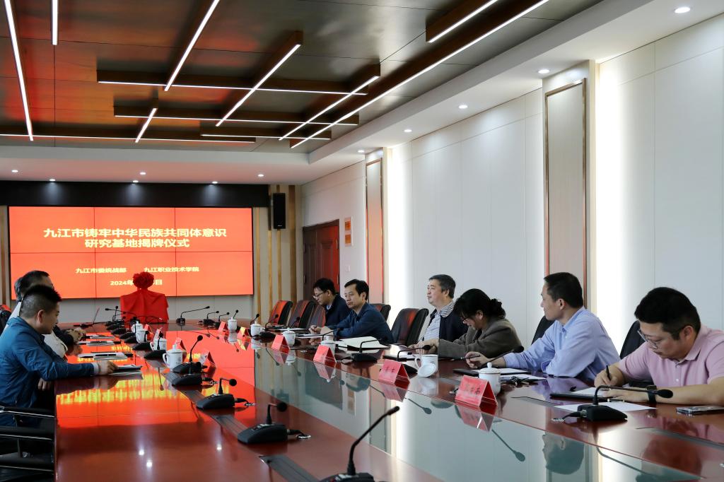 九江职院新闻网讯(党委统战部)4月16日上午,九江市铸牢中华民族共同体意识研究基地揭牌成立仪式在濂溪校区办公楼708会议室举行。党委书记胡永红,市民族宗教事务服务中心主任胡定文、副主任虞功智,党委委员、副院长曾劲出席,学校及市委统战部、市民族宗教事务服务中心相关负责人参加。